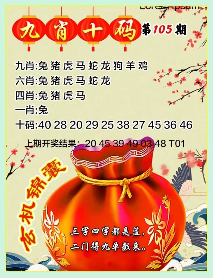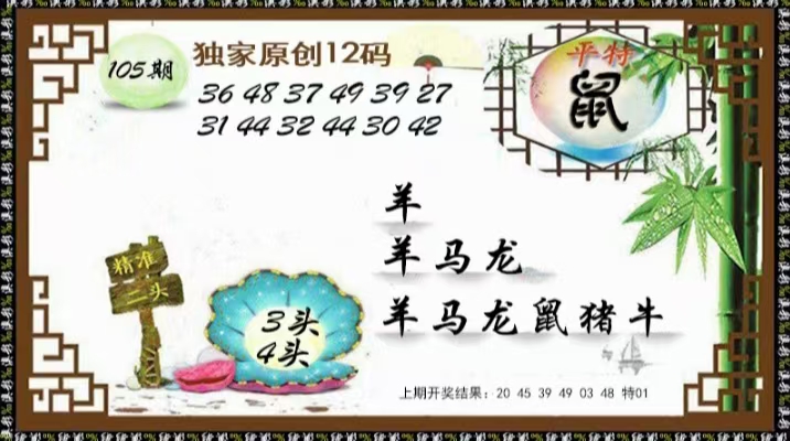 | 105期:九肖【牛虎鼠猪马羊狗兔龙】开:?00准 | |||